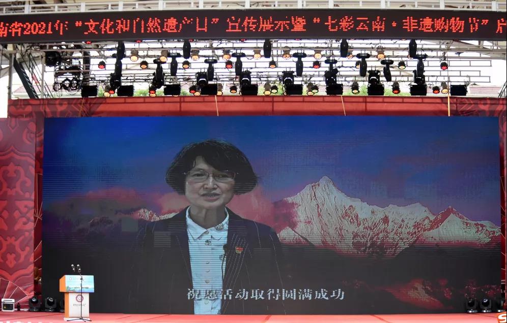 曾艳厅长在致辞中说,为庆祝中国共产党成立100周年,进一步提高人民群众对非物质文化遗产的保护意识,自觉传承、弘扬中华优秀传统文化,积极营造非遗保护良好社会氛围,我省各地组织了丰富多彩的2021年“文化和自然遗产日”宣传展示暨“七彩云南·非遗购物节”系列活动。今年“文化和自然遗产日”的主题是“人民的非遗 人民共享”,希望各地坚持以文塑旅,以旅彰文,紧扣主题,结合各地特色,注重安全保障和疫情防控,组织开展好系列活动。希望我们的活动体现非遗保护为了人民、保护成果人民共享的理念,推动非遗系统性保护水平提升,发挥非遗在赓续传承中华优秀传统文化、促进文旅融合中的重要作用,助推文化和旅游强省建设。祝愿活动取得圆满成功,热忱欢迎全国各地的游客朋友到云南来——“游七彩云南 品非遗盛宴”。