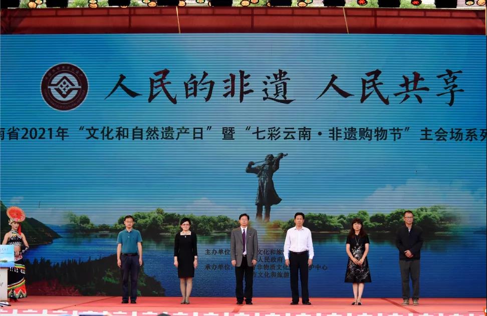 2021年6月12日上午10:00时,随着云南省文化和旅游厅二级巡视员宣布“云南省2021年‘文化和自然遗产日’宣传展示暨‘七彩云南·非遗购物节’系列活动启动”,由云南省文化和旅游厅、玉溪市人民政府主办,云南省非物质文化遗产保护中心、玉溪市文化和旅游局承办的云南省2021年“文化和自然遗产日”宣传展示暨“七彩云南·非遗购物节”系列活动正式在主会场玉溪市红塔区聂耳音乐广场拉开帷幕。启动仪式上,云南省文化和旅游厅党组书记、厅长曾艳通过视频代表活动组委会及省文化和旅游厅致辞,玉溪市人民政府副市长李劲松代表玉溪市人民政府致辞,国家级非物质文化遗产代表性项目棕扇舞市级非物质文化遗产代表性传承人倪伟顺代表全省传承人发言。来自全省各州(市)部分非遗代表性传承人、演职人员、非遗学者、新闻媒体、非遗保护工作者、广大市民和旅行者参加了启动仪式。