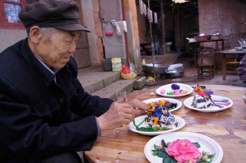 杜武超多才多艺,在当地享有很高的威望,他不仅擅于工艺美术,而且还喜好音乐。在年青的时候,为了生活,他学过裁缝、修过钟表、自学绘画,这为后来的工艺制作奠定了基础。他制作祭祀祖先用的金属神龛灯,材料简单,制作精细、外型美观。在丧事中制作的面塑系列更是丰富多彩、形象逼真,具有一定的欣赏价值。每逢节日,他还可以制作舞龙、舞狮及丧事时做棺罩等;在平常休闲时,他还经常演奏笛子、电子琴、二胡等乐器,还会编排花灯戏,在当地得到群众的喜爱和认可。在他的带领下,里达镇神龛灯、纸扎、棺罩、面塑等传统工艺得到了很好的传承,并在原来的基础上有所创新和发展。同时,为了更好地传承我镇面塑手工艺,里达镇党委政府高度重视,由文化站牵头每年组织举办面塑培训班进行培训。截止目前,共培训了25期2800人。