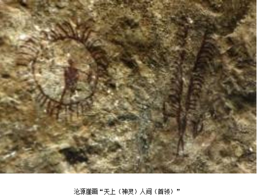 1.原始王者之作:沧源崖画“天上人间”图。想象中的“天上神灵”和“地上首领”(也可能即崖画作者),仿佛相互对语、歌唱,互为“知音”,为今日云南留下最早表现天地人文观念的艺术样式——高水平野外绘画遗产。
