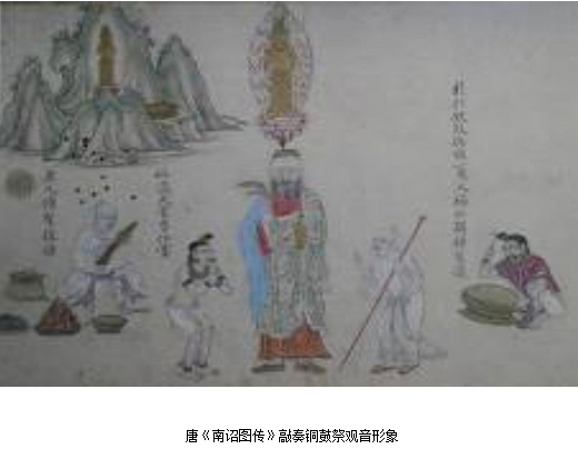 ⑵唐《南诏图传》宋《大理国画卷》铜鼓祭观音画面,国王、高官参加,铜鼓功能及祭祀习俗传统承前启后,一脉相续。