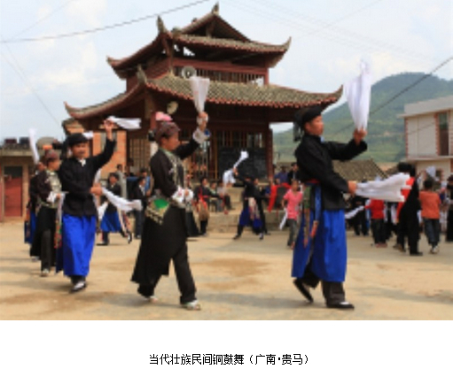 ⑶当代,铜鼓文化艺术仍在流传,在若干民族地区依旧兴盛。典型者如:克木人铜鼓歌舞(勐腊);彝族铜鼓舞(富宁木树下寨、富宁老寨、麻栗坡城寨);壮族铜鼓舞(广南贵马);布依族铜鼓乐奏(罗平);彝族蜡染、刺绣描绘的铜鼓纹样(麻栗坡城寨)。