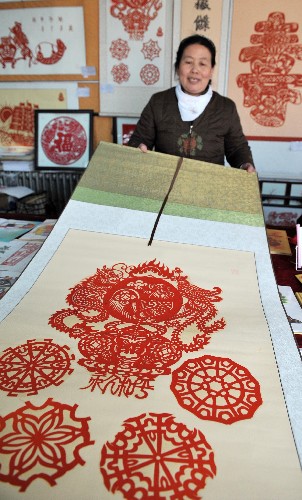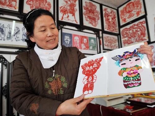 民间剪纸艺术家伏兆娥在向游客介绍自己的剪纸作品