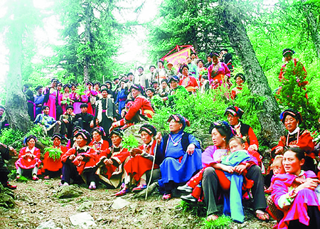 农历五月初五,茂县羌族妇女将不分老幼,身着鲜艳民族服饰,佩戴银首饰前往女神梁子石塔前,参加羌民族古老的传统妇女节———瓦尔俄足。