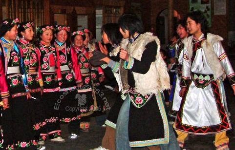 其实,盛会从农历五月初三就开始了,由会首组织数名净身妇女,手拿香、蜡、酒、柏香、馍、刀头等贡品,结队前往女神梁子的石塔前,敬祀歌舞女神莎朗姐,请女神赐以歌舞,谓之“引歌”。回到村里,再逐户告知信息,谓之“接歌”。五月初四,妇女们忙碌地准备美食,以备第二天食用;未婚女性则精心为情人准备亲手绣制的礼物。初五清晨,在晨曦朝阳中,开启尘封的重阳咂酒,祝福全寨人畜两旺、五谷丰登。萨朗舞是活动的主要内容,由老年妇女领跳,之后,再逐一将歌舞传授给下一代。男人们则以歌舞附之,并以腊肉、咂酒、馍馍等食品伺候。活动间歇,已婚妇女向青年女性传授性知识,持家之道等知识。或有情人漫步私语;或女性间相互笑谈。累了,妇女们三三两两围坐一团,相互品尝美食、畅饮咂酒,笑谈人生。整个节日活动持续3天,妇女们尽显其能,忘情欢跳萨朗,农事和家务事皆由男羌民操持。