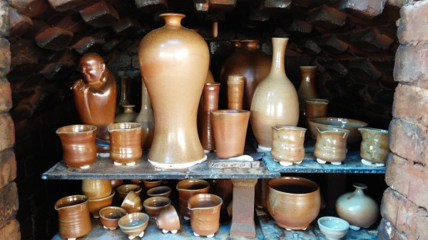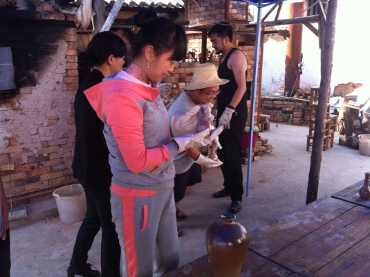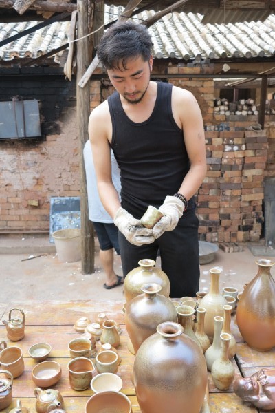 主要围绕华宁县家族式制陶传承世家进行探访。清晨9时许,考察组来到宁州镇上村社区居民委员会的一个破旧的寺庙,整齐摆放的各式制陶工具,别致陶器的组合陈列,大堆小堆的柴垛尽收眼帘。柴窑建在寺庙背后的一块空场地上,用红砖头砌成,是方形窑,分为前窑和后窑。一位年轻的帅气的小伙子戴上手套开始开窑,窑前摆放着几十件刚出窑的陶器。据了解,小伙子名叫曹栋,出身于华宁县的陶瓷世家,外婆李自轩是制陶技艺省级传承人。其陶器作品既有传统造型,又有自己创作的时尚元素,不同于祖父辈。曹栋大学毕业后,开始研究传统陶瓷工艺的烧制。一次在景德镇看到用全木柴方式烧制陶瓷,受到启发,回到华宁后搭建了第一座方形柴窑。他建造的柴窑,用松木烧制,追求木灰与土的自然结合,土与火的直接对话。通过不断尝试和窑炉改建,成品率有了很大提升,从原先的15%提升到了70%左右。不上釉落灰烧制方法也起得突破性进展。窑内的落灰自然依附在坯体之上,形成不同质感、层次丰富的自然灰釉,呈现白色、黄色、绿色、蓝色、橙色、紫色、酱黑等各种颜色的变化和花纹,自然而无粉饰之气,每件作品都是独一无二的。烧制出来的作品主要有花瓶、花插、装饰品和茶壶、茶杯等,古拙、朴素,深受各界人士喜爱。