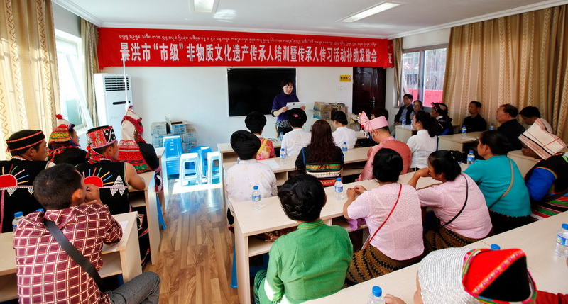 此次培训对象为景洪市50名第三批市级非物质文化遗产传承人。培训班由市文化馆馆长玉坦为传承人传达了《中华人民共和国非物质文化遗产保护法》和《国家级非物质文化遗产项目代表性传承人认定与管理暂行办法》,并对传承人积极进行传承活动给予了鼓励和要求。培训班还邀请西双版纳州文化馆原馆长段其儒,为大家进行了题为《传承人的责任和非物质文化遗产在现代社会中的影响》的讲话。