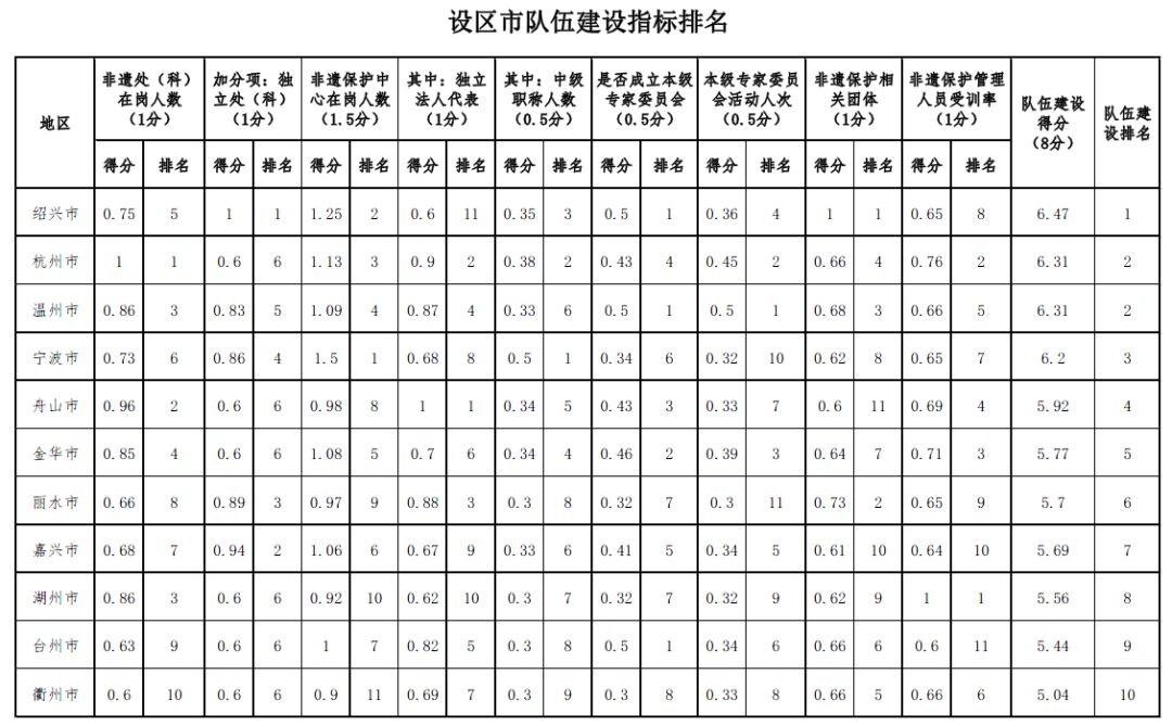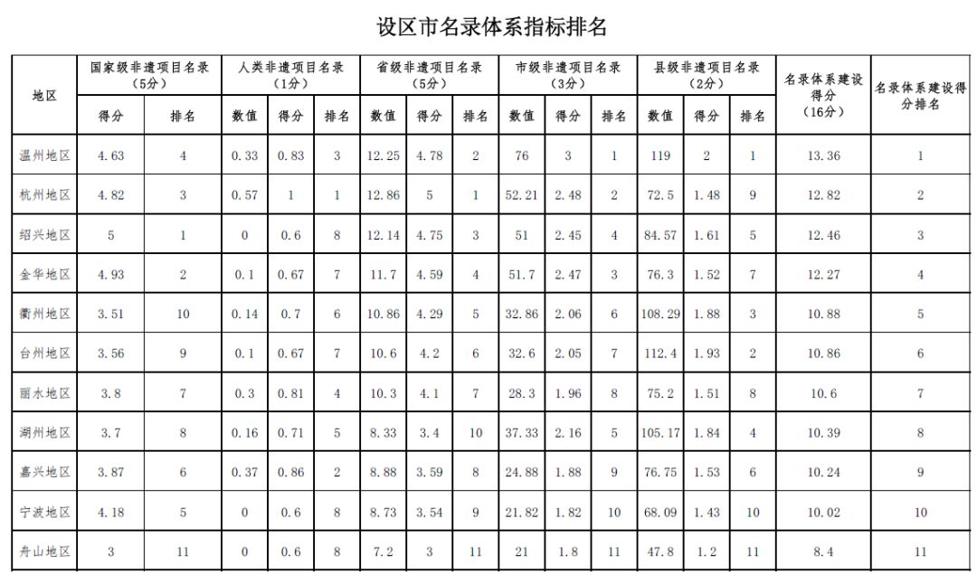 (二)以市、市本级、县(市、区)三个层次排位,客观评价市、县(市、区)非遗保护综合水平。评价体系对各地区的非遗保护工作进行综合评价,并采取设区市之间、市本级之间及县(市、区)之间三种排名方式,肯定了非遗保护工作扎实的地区,也对工作相对薄弱的地区起到了激励作用。通过和其他地区比较,能找到本地区的工作短板和弱项指标,有助于推动非遗馆建设、信息化数据填报、传承人带徒等工作的发展。