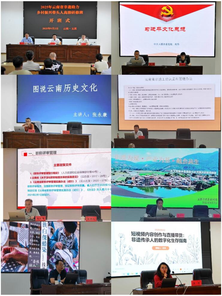 9月1日至9月6日,由云南省文化和旅游厅主办,玉溪市文化和旅游局、玉溪市非遗保护中心、玉溪市委党校协办的2025年云南省非遗助力乡村振兴带头人高级研修班,汇集了全省80位非遗工作者、非遗传承人和非遗工坊带头人,通过7场专题授课和3次现场教学相结合的方式,圆满完成了一次丰富且深刻的研培之旅。