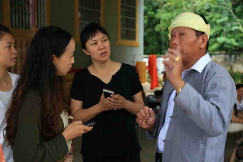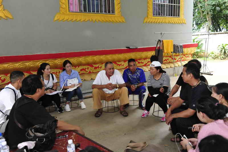 项目组组长肖依群和象脚鼓制作艺人交谈