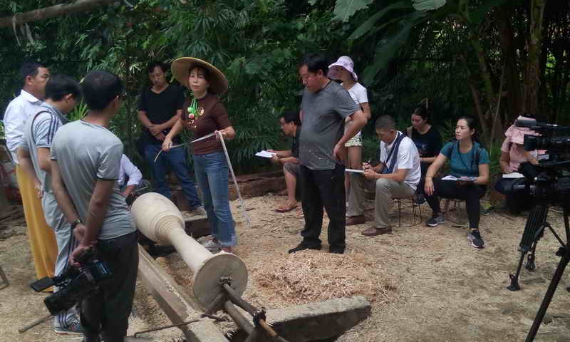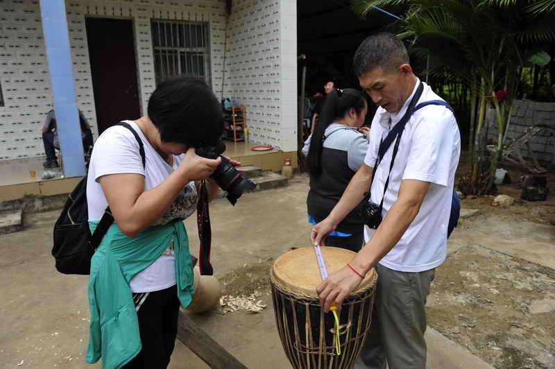 一进入田野间,各位学员就立刻被那美丽傣族村庄风景吸引住了,更被象脚鼓制作技艺传承人们的精湛技艺所震撼。傣家象脚鼓外形似一只精美的高脚酒杯,它是用一整段木材制作,通体中空,上端是杯形共鸣体,鼓面蒙皮,鼓皮四周用细牛皮条勒紧,拴系于鼓腔下部,并可调节其松紧度。鼓身外表涂漆,鼓腰和鼓的下半部雕有装饰图案,有的还在鼓身上系有绸带。在孟定镇贺海村的传承人果亚家里,老人为我们讲述着那傣家象脚鼓的传说,大家倾听着,仿佛沉浸在那古老的故事中,笔尖唰唰的写字声,相机咔嚓咔嚓的快门声!大家几乎一刻也不停息,忙个不停地用文字、用影像记录着身边的一切。