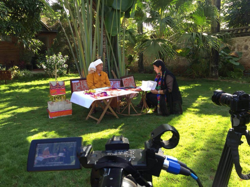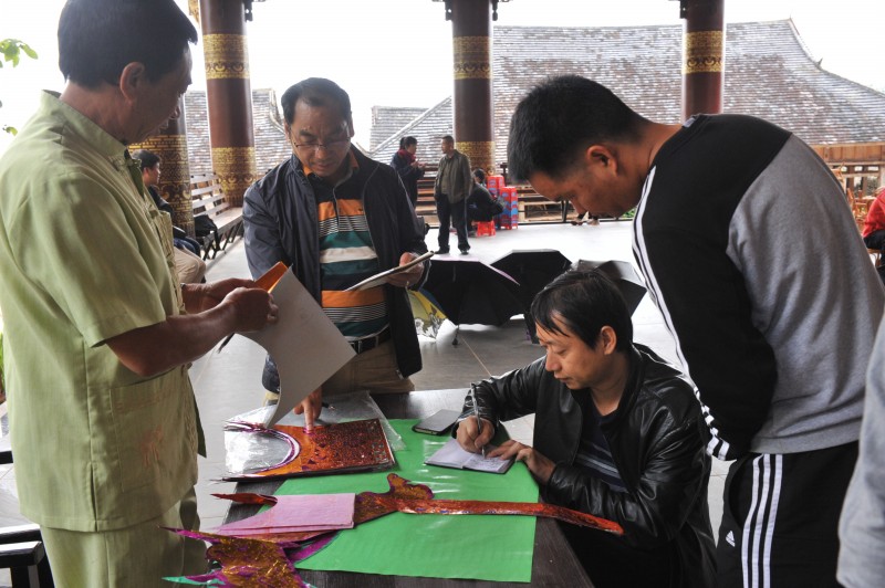 在调查期间,我们还取得了一个意外的“保护成果”:王文魁副县长在陪同我们对孟连傣族剪纸进行了深入了解后,深深地被傣族剪纸这项古老却又充满活力的艺术迷住了,并折服于民间艺人岩弄老师精湛的技艺和无私传承的高尚品德。2017年11月12日下午,河北汉子王文魁穿上了傣族盛装,按照传统礼仪举行了拜师礼,拜岩弄老师为师学习傣族剪纸。这个举动不仅反映了傣族剪纸的魅力,也体现了孟连县委、县政府对于做好孟连文化遗产保护工作的重视和决心。