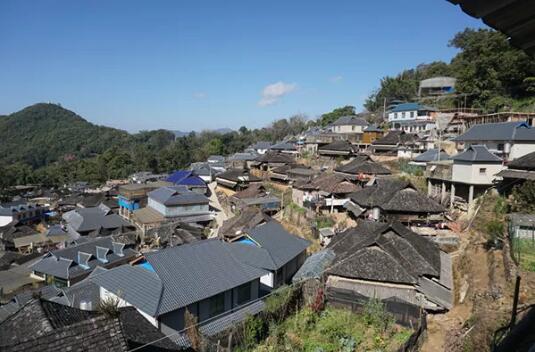 视线透出窗外,村子里来来往往的行人多半是中老年人,他们身材不是很高大,反而非常纤细。他们的面貌很容易让人混淆,因为他们服装的色调主要是黑色,无论男女都穿着统一的黑色服装。中年女性会穿有各色上衣及有条纹图案的“筒裙”,而老年女性则穿纯粹的黑色上衣和黑色的“筒裙”。他们还会在头部缠“包头”。“包头”在很多民族中都很常见,类似于汉族戴帽子,但是在形式上有区别。眼前那一堆堆紧紧挨着的黑色建筑是他们的房子,干栏式两层木质结构的瓦房。底层主要是由几根柱子支撑起来的空地,里面装满了杂物。