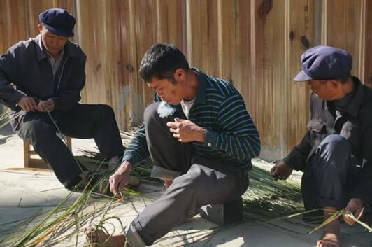 那一天,新房附近布满了人群。一群妇女正在用竹篾编织着尚未成型的东西,不远处的三位大爷正在赤脚勾住一种细长的类似茅草的植物,然后编捻成绳,编的同时顺便绕在略显沧桑的脚丫上。它们据说是要挂在房子四周,用以阻挡不好的东西进到房子里面。