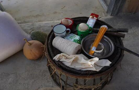仪式开始时,一个竹篾圆形桌子出现在房子门口,桌上摆放着一些祭祀品。有一些黄色条状的腊条、两杯米,米上面各自放着一个鸡蛋,还有一股手臂粗的白线。龙把头蹲在旁边,手里握着一个竹筒,开始念念有词。两位老人将一张画有特殊图案的用来辟邪白布贴到了房柱上。