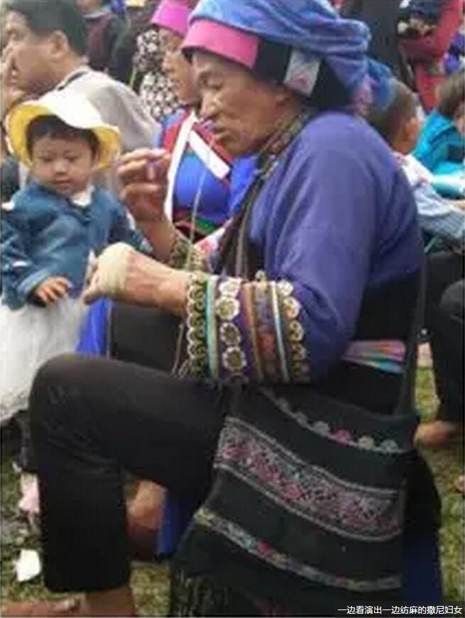 一边看演出一边纺麻的撒尼妇女