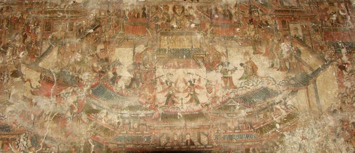 4、寺庙壁画。目前全省寺庙(包括塔、亭)中有壁画者约数百处,它们分别属于佛教、藏传佛教、南传上座部佛教、道教、儒教和民间宗教(本主、土主信仰)等。其中基本保存古代原貌并非近期重新修复绘制的有代表性者有: