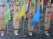 4、傣族祭幡。祭幡,傣语叫“栋”,是南传上座部佛教信徒在做各种赕佛(礼佛)仪式时敬献给佛寺以表祈求佛祖荫佑心愿的一种特别画幅。多为布质。有手绘和手工直接织成图画二种。一般长500—1000cm,宽30—35cm上下。分“荷栋”(幡头)、“多栋”(幡身,即画面)、“汉栋”(幡尾)三部分。幡头即挂档,呈塔顶形,多用竹、篾编成或木片剜成。幡尾挂象足形布坠包,使祭幡挂起来时能垂直坠平。画的内容多为佛经故事、传说、佛像、佛塔、吉祥图形和因果训谕——劝善说教等。西双版纳州、德宏州、临沧市、普洱市、保山市的傣族和部分布朗、佤、德昂、阿昌族佛寺多有此物,其中景洪勐罕乡曼岭佛寺、景谷东那佛寺和北佛寺、耿马孟定佛寺等悬挂的“栋”以数百上千计,属佼佼者之列,一些“栋”的古老精品让人叹为观止。