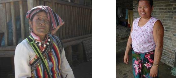 左起依次为:布朗族文身(勐海); 傣族文身(耿马); 独龙族文面(贡山);傣族女子文身(耿马)