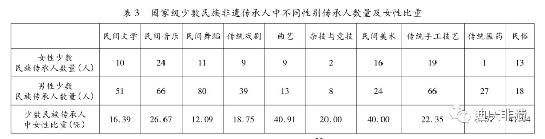 民间文学的女性少数民族传承人为10人,男性为51人;民间音乐女性少数民族传承人24人,男性66人;民间舞蹈女性少数民族传承人11人,男性80人;传统戏剧女性少数民族传承人9人,男性39人;曲艺女性少数民族传承人9人,男性13人;杂技与竞技女性少数民族传承人2人,男性8人;民间美术女性少数民族传承人16人,男性24人;传统手工技艺女性少数民族传承人19人,男性66人;传统医药女性少数民族传承人1人,男性27人;民俗女性少数民族传承人13人,男性18人。(具体各类别中女性传承人比重见表3)民族文化41其三,民族方面,怒族、门巴族、普米族、塔塔尔族、高山族、珞巴族、基诺族和独龙族等8个少数民族没有对应的非遗传承人。